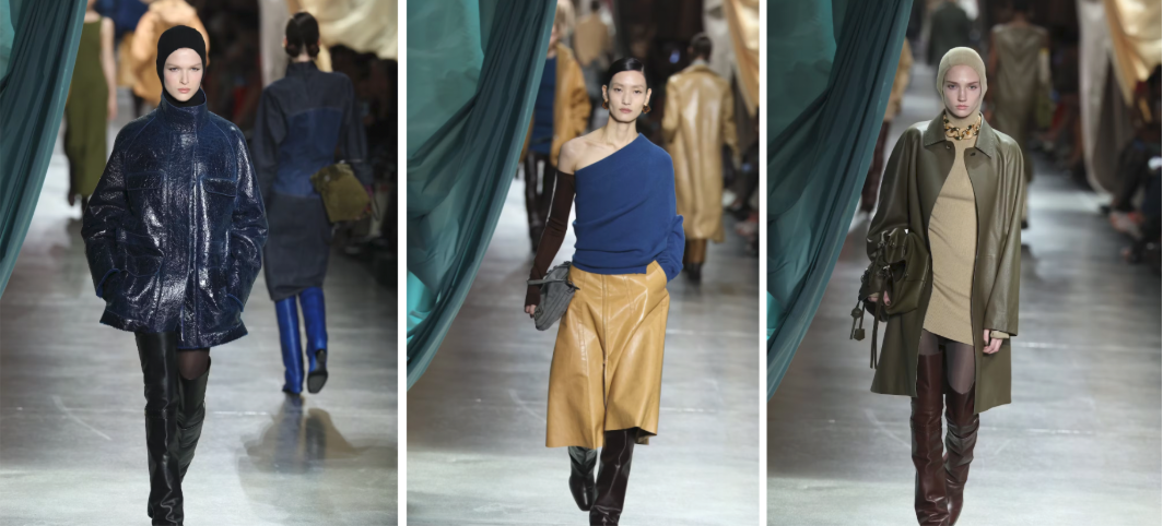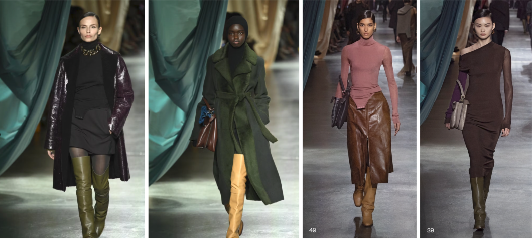 A notable Fendi look, as pictured above, is an olive leather below-the-knee buttonless collared coat, paired with a tan knit dress with head covering, a necklace, an olive leather bag, sable leather thigh-high boots, and sheer black stockings.